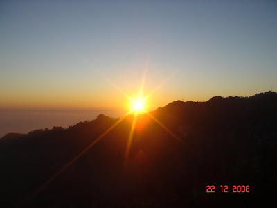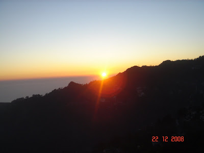 Hi, just 2 days back we returned back home after enjoying our winter holidays at Mussorie. It was truly an unforgettable experience. We stay at Noida and Mussorie is at a distance of about 270 Kms. We started from our home early in the morning around 9 am ( For us 9am is early in the morning lolz :)) ) in our good old Wagon R , my husband was driving and me and my son were enjoying the travel by having chips, soft drinks and as usual some great fights and arguments, lol. Should have seen my son…. occupied the whole back seat with pillows and soft blankets on either side with his laptop and psp by the side and listening to songs from the laptop with his head phones on, in short he was sitting like a maharaja in the backseat . The roads were terrible and these kind of roads am seeing for the first time in my life and can you imagine it took us 10 whole hours to reach our destination!!! YES we made 270 Kms in 10 hrs hmmmn that must be a world record I guess. But once we reached the foot hills the roads became ok and the beautiful scenes of the forests are still fresh in my eyes. Mussorie is about 6000 ft above sea level and really a perfect holiday destination. We reached Mussorie after a long tiring journey of 10 hours and finally reached our hotel…. The Avalon Resorts, where we had already booked our room 2 weeks back. And lolz they had given us a cottage which was at the highest location among all the other cottages thinking that we'll enjoy the beautiful view from our cottage. Yes, it is absolutely true the view outside our cottage was the best and there was a huge window besides our bed and whenever we looked at the window it was like a beautiful digital photo frame changing its picture every 1 hour. Especially the sunset and the sunrise were very beautiful. There are hardly any words to describe its beauty. From our cottage we could also see the snowy peaks of Himalayas in the right hand side and at the same time on the left hand side of our cottage we could see the beautiful twinkling lights of the city of Dehradoon. We felt like that we were in heaven WOW!!! While am writing this post I feel like I am still there in Mussorie. Unlike other hill stations I visited in India, Mussorie has a very active night life. The mall road in Mussorie has some very good shops for buying woollens and handicrafts. We visited Kempty falls, a waterfall about 15 kms from Mussorie, which was very beautiful and we saw people taking bath in that waterfall don't know how they coped with cold icy water!!! The weather though was not very cold. Sometimes in the afternoon I had to take my sweaters off as it was fairly warm. The best part of the whole trip was climbing up to our cottage and then climbing down lolz that was the tiring part of the whole journey. We had to climb about 60 steep steps and from there have to walk about 200 feet that too very steep path to reach our cottage. But it was worth the hard work and it was also a great exercise. Cause if we had got a cottage at the bottom of the resort we could not have enjoyed the beautiful sceneries that we enjoyed from our cottage. At last the day came we had to leave Mussorie and all the three of us did not want to leave that beautiful place filled with fresh air, green forests and a very peaceful slow, steady life unlike cities.... hmmmn but that is not possible practically and with a heavy heart we bid adieu to Mussorie and came back home sweet home. Above are some beautiful photographs we took in Mussorie and hope you enjoyed the post and plz leave your observations and thoughts in the form of comments. I would love to hear from you and if you want any information feel free to contact me through email. Last but not the least the above pictures were taken by my son, Arjun and are copyrighted :) Bye bye.